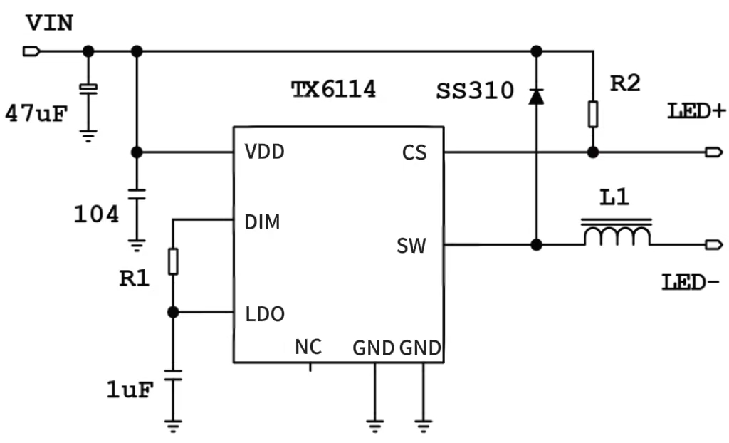 TX6114内置5A功率MOS开关降压型高精度、高亮度LED恒流驱动控制器。